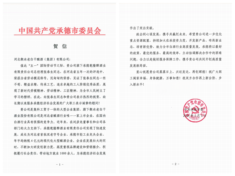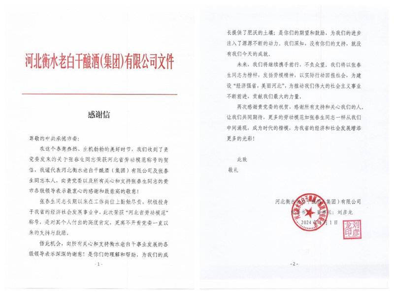河北老白干釀酒集團在感謝信中寫到:“張春生同志長期以來在工作崗位上勤勉盡責,積極投身于我省的經濟社會發展事業之中,此次榮獲河北省勞動模范,是對其個人付出的高度肯定,更離不開承德市黨委一直以來的支持與鼓勵。我們將以張春生同志為榜樣,發揚勞模精神,以實際行動回報社會,為建設經濟強省,美麗河北,貢獻我們最大的力量”。