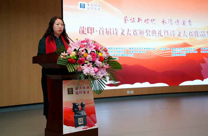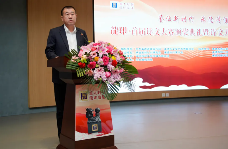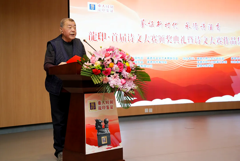 承德市郭小川研究會會長步九江發表致辭,“鑒證新時代 承德詩酒香——龍印·首屆詩文大賽”這場活動參與人員之多,高手云集之密,采訪挖掘之深,作品質量之高,在承德文學史上尚屬首次。
