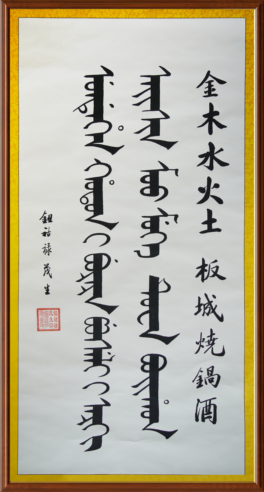 近日,板城酒業榮幸地收到了一幅珍貴的書法作品。這幅作品不僅體現了板城酒業深厚的文化淵源,更用滿漢兩種語言書寫了“金木水火土,板城燒鍋酒”的千古妙對,成為了板城燒鍋酒博物館館藏的一件獨特藝術瑰寶。