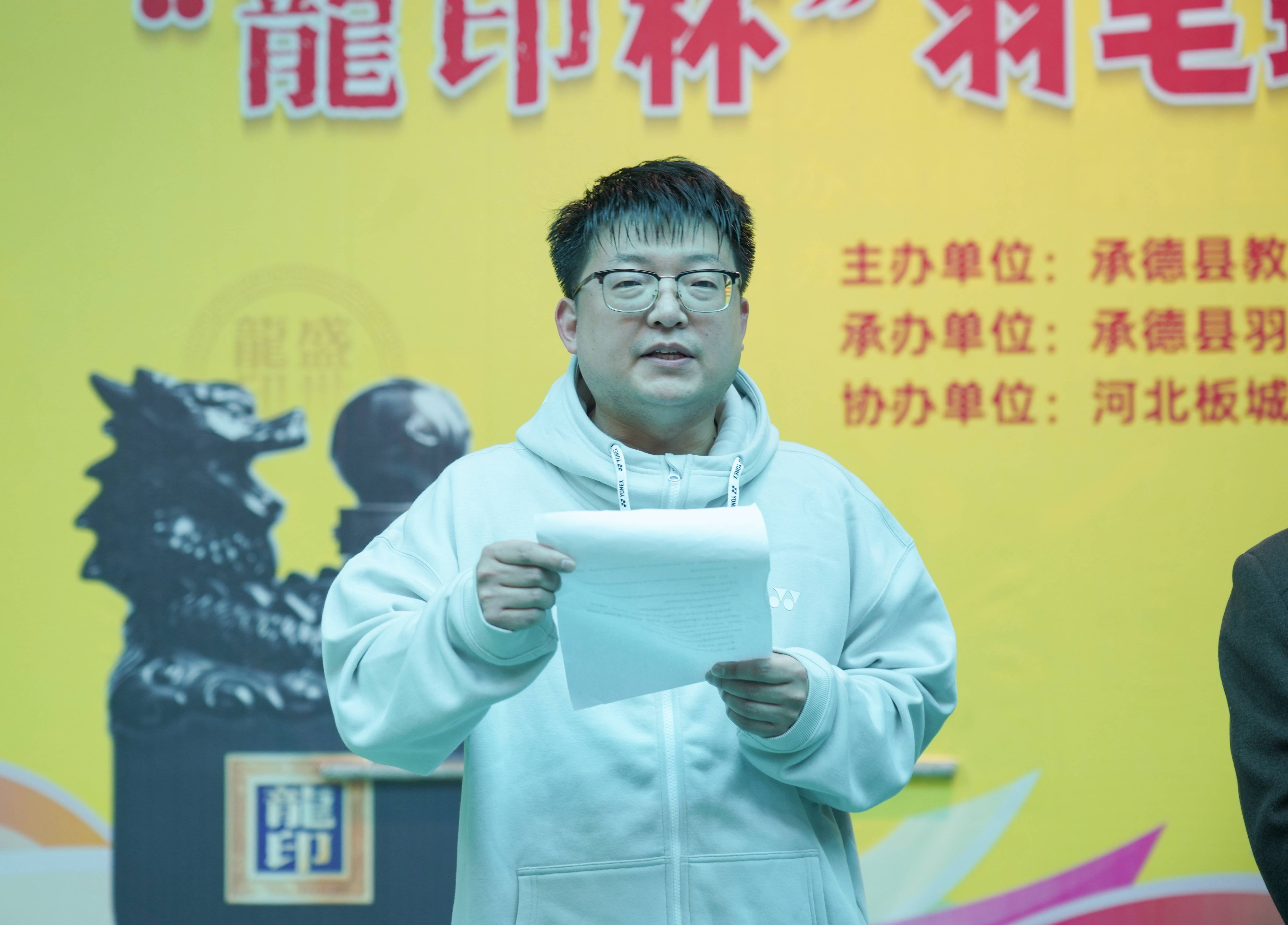 承德縣教育和體育局黨組成員朱瑞東首先進行致辭,他表示承德縣教育和體育局積極響應全民健身號召,開展了形式多樣的體育活動,羽毛球是一項深受大家喜愛的運動項目,通過舉辦此次賽事,增強了大家體育意識,發揚體育精神,有效推動承德縣的體育事業發展,希望各參賽人員充分發揮“團結友愛,奮勇拼搏”的精神,賽出好成績。