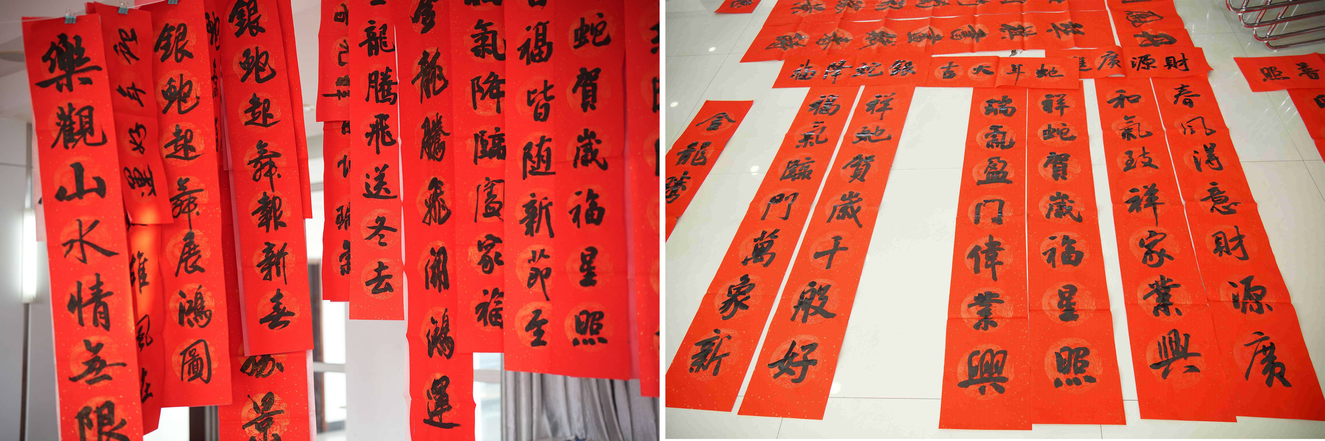 隨后,各位書(shū)法老師現(xiàn)場(chǎng)揮毫潑墨,書(shū)寫(xiě)新春祝福。一張張紅彤彤的春聯(lián)象征著喜慶吉祥,傳遞著“喜迎新春,諸事和順”的美好愿望。