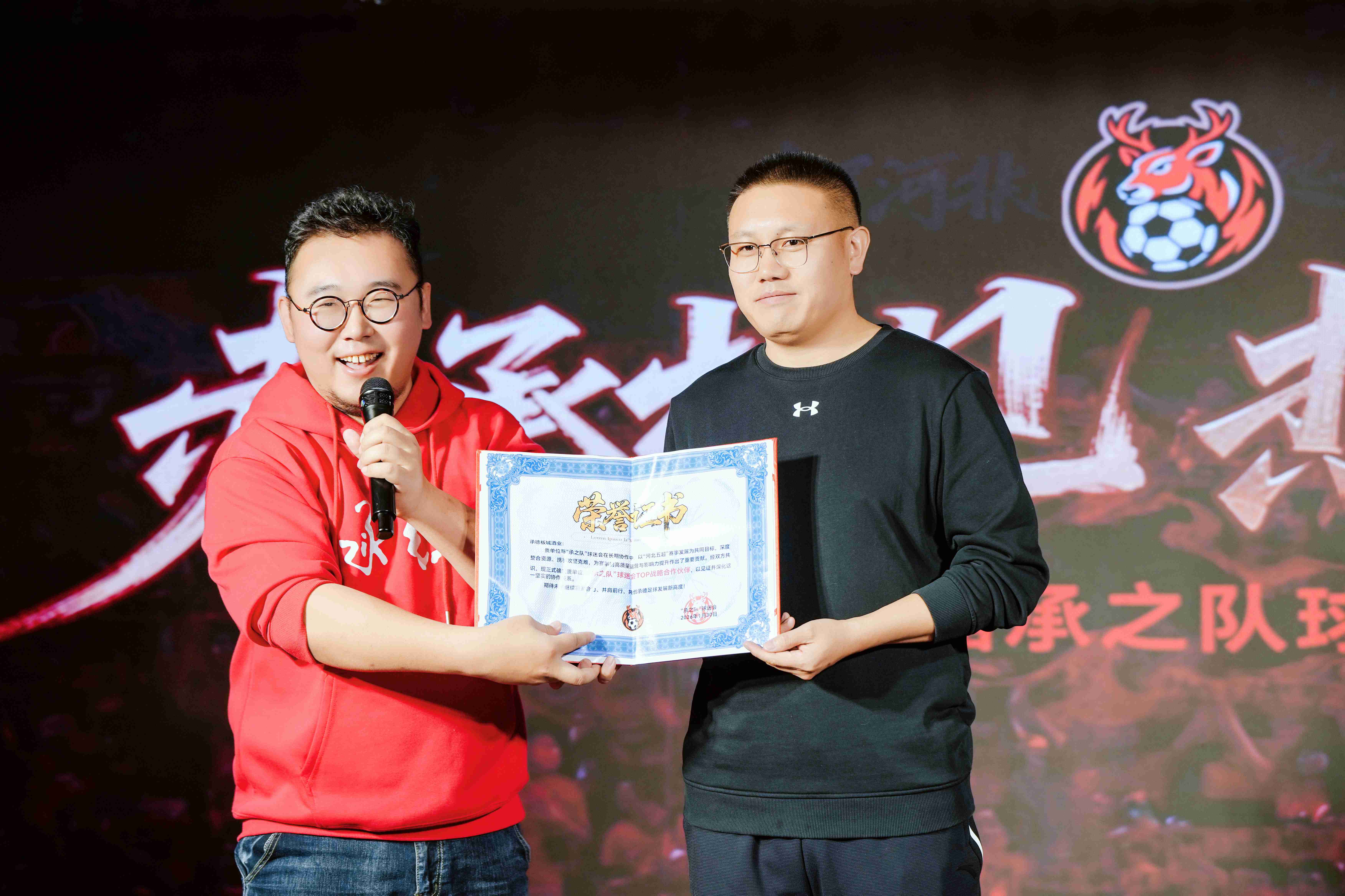 致辭結束后,現場舉行了授牌儀式,承德新鮮事兒創始人、“承之隊”球迷負責人朱孟博向板城酒業授予了“TOP戰略合作伙伴”榮譽證書,以表彰其長期以來的鼎力支持與深度協作,共同推動承德足球事業的發展。這一榮譽,見證著雙方深厚的情誼與堅實的伙伴關系。